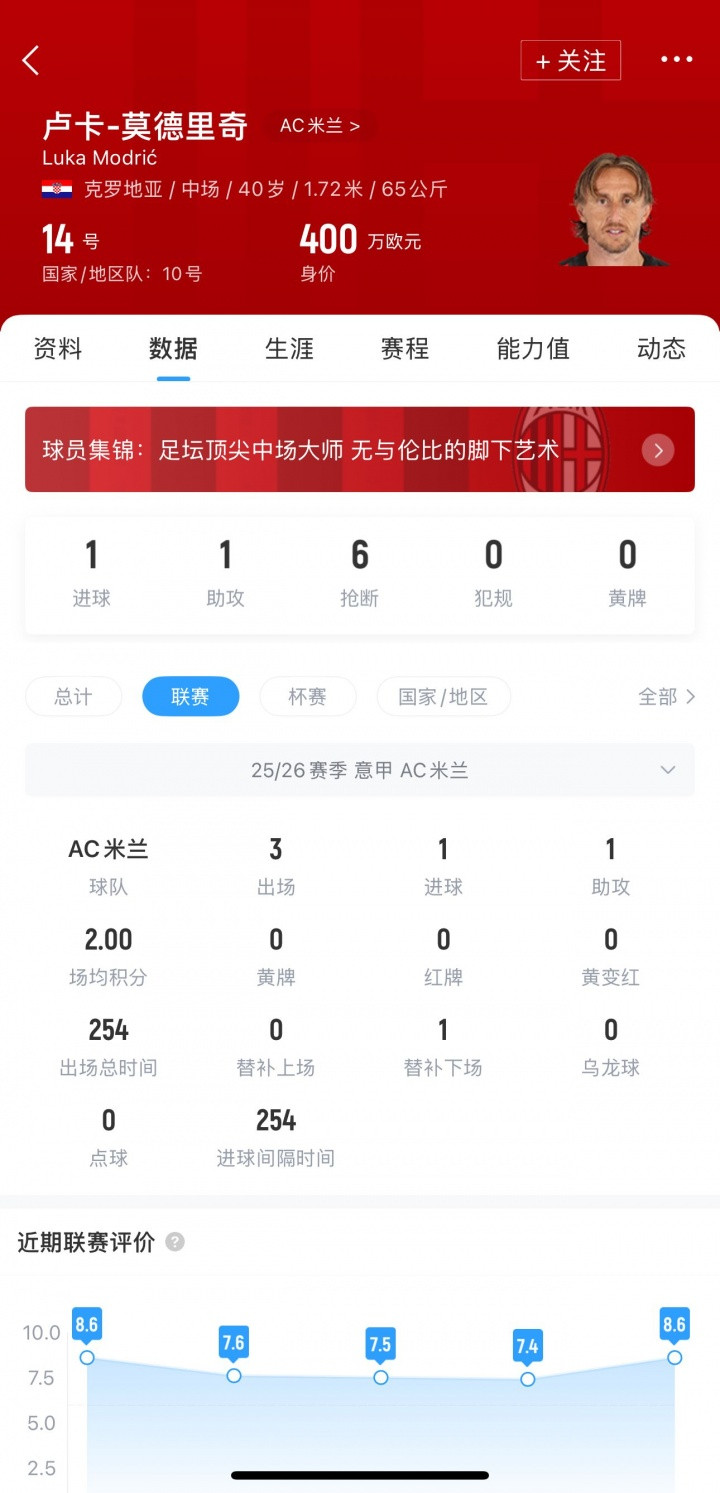 莫德里奇今夏加盟米兰,代表米兰出战4场正式比赛,其中意甲3轮1球1助,帮助米兰取得连胜。