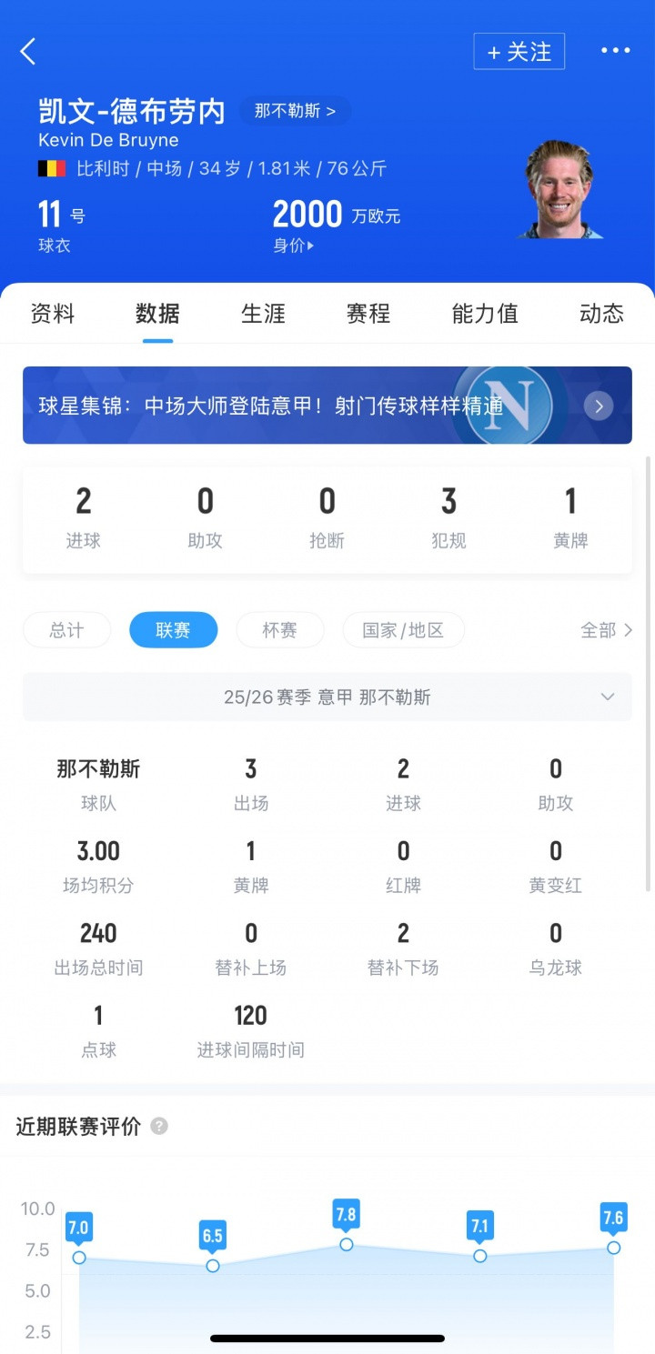 34岁的德布劳内也在今年夏天登陆意甲,他加盟那不勒斯后出战3轮意甲打进2球,帮助卫冕冠军3连胜领跑意甲。