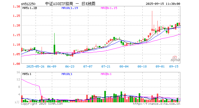 9月15日,截止午间收盘,中证A50ETF招商(512250)涨1.25%,报1.211元,成交额36.08万元。中证A50ETF招商(512250)重仓股方面,贵州茅台截止午盘跌0.06%,宁德时代涨9.85%,中国平安涨0.31%,招商银行涨0.47%,长江电力跌0.39%,美的集团涨0.21%,紫金矿业涨0.78%,比亚迪涨3.47%,中信证券涨0.17%,恒瑞医药跌0.17%。